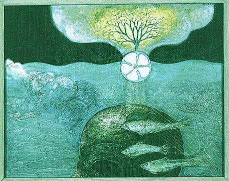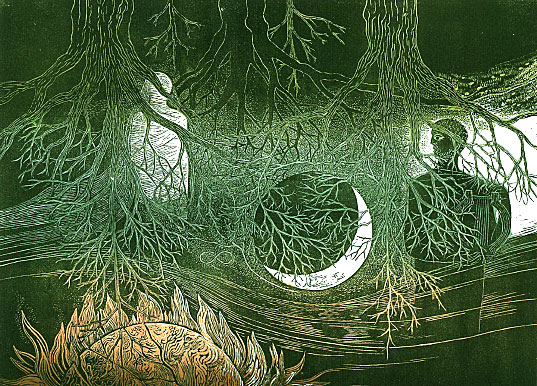 This page introduces some of my work. I take my subjects from myths, religious symbols or the origins of visual communication, and there are some examples above. I work in oil and watercolour and make Artist's Prints in small limited editions, using lino, wood engraving and etching. |