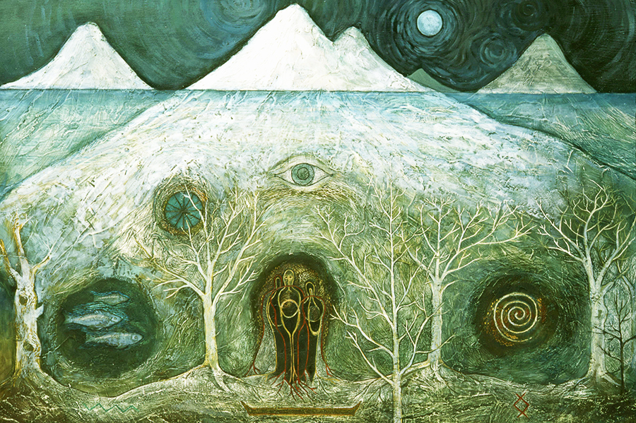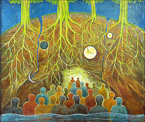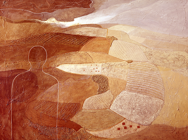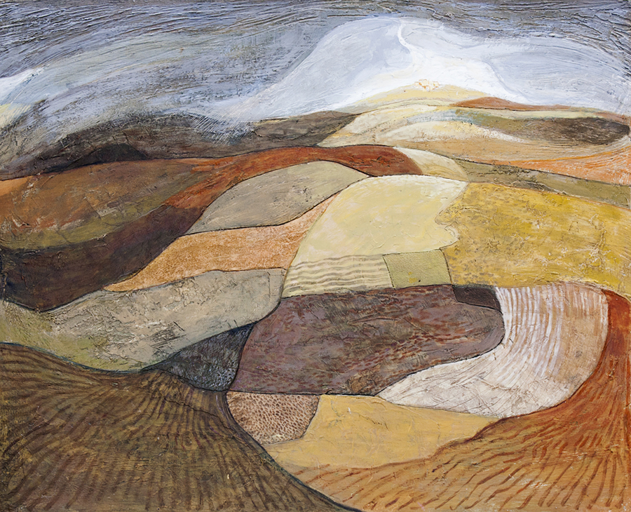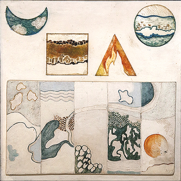 Bottom left: The hidden deep • Bottom centre 'Elements - (acrylics/collage)' • Bottom right: Seeking the light